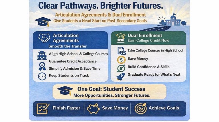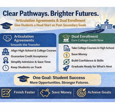 Creation of seamless articulation agreements and dual enrollment models that provide students with a clear head start on post-secondary goals.